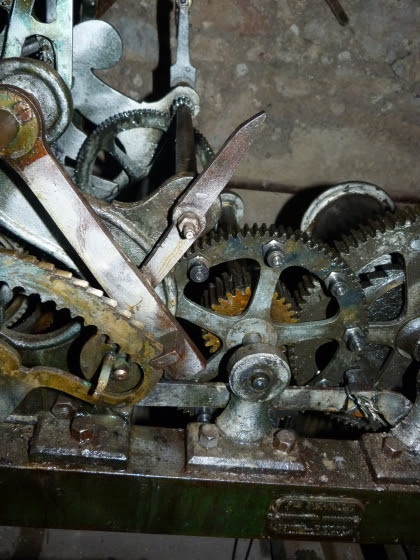 Das "neue" Werk dient nur dazu, Stundenschläge auszuführen, es gibt kein außen sichtbares Zifferblatt. Als wir den Glockenturm besucht haben, war leider kein Licht eingeschaltet, deshalb habe ich nur Blitzaufnahmen gemacht und im Finstern auf die Einzelteile gezielt. Hier ist das ganze Werk zu sehen: