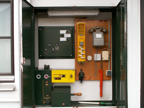 Ergänzung 14.9.2014: In Waidhofen ist die "Fahrdienstleitung" für den kleinen Rest der Ybbstalbahn in einen einzigen Schrank zusammengeschrumpft worden: Links unten sieht man das Befehlsabgabefeld für eine Einfahrt und daneben, in einem eigenen Gehäuse, den Induktor. Darüber ist die Signalanzeige für das Einfahrsignal Y und das Verschubsignal VL angebracht, das hier mit dem Schlüssel auf Frei gestellt ist. Damit der Befehl abgegeben werden kann, muss dieser Schlüssel im Zentralsschloss oben umgesperrt. Zusätzlich muss natürlich die Einfahrweiche 201 in einer der beiden Stellungen versperrt sein, und natürlich muss auch der Sperrschuh 202 aufliegen. Auch alle anderen Utensilien für den Betrieb sind vorhanden: Sprechstelle, Fernsprecher, Fahne, Taschenlampe mit Rot- und Grünblende und der Abfertigungsstab – sozusagen eine "Fahrdienstleitung in the box":