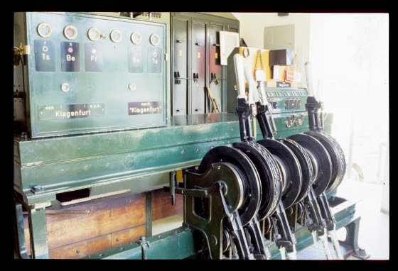 Am Stellwerk 1 befand sich ein typischer Blockapparat – leider habe ihn aber nicht vollständig fotografiert! Am folgenden Bild sieht man den oberen Teil der Blockfelder, und man kann nun raten, was sie für Bezeichnungen haben. Ganz links und rechts befinden sich sicher die Be+Ts-Paare, und das rechte der zwei mittleren Felder ist das Ff-Feld, weil es hier eine weiße Blende zeigt. Unklar ist aber das rote Feld links der Mitte: Vermutlich ist es ein Za-Feld für eine Anschlussbahn auf der Strecke nach St.Veit.