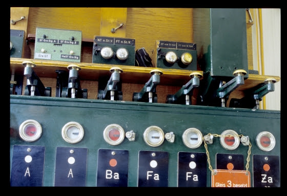 Etwas erstaunlich ist dieses Bild: Es ist eindeutig das Foto eines Schaltpultes zum Stellen eines Hauptsignals. Allerdings gibt es ja auf der Hebelbank unterhalb des Blockapparats dafür zwei Knaggen! Und es wäre noch erstaunlicher, wenn hier ein Ersatzsignal gestellt werden könnte: Das liegt ja ausschließlich in der Verantwortung des Fahrdienstleiters, und am zweiten Bild des Befehlswerks sind auch die Signaltasten "ST Ers.Sig.A" und "ST Ers.Sig.Z" deutlich zu erkennen: