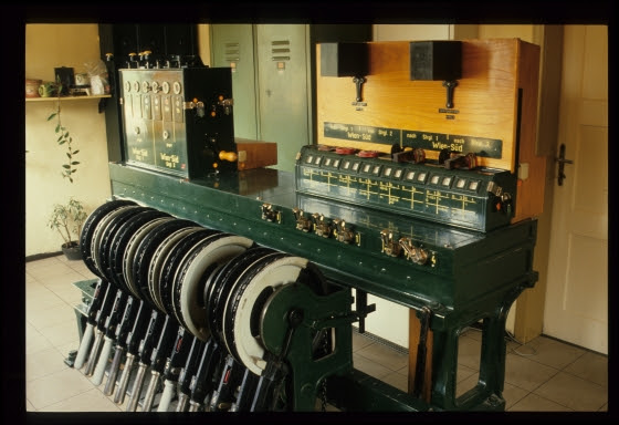 Fahrdienstleitung ein Knebelapparat mit den Blockwerken für die Fahrten Richtung Wien, Wiener Neustadt und St.Pölten: