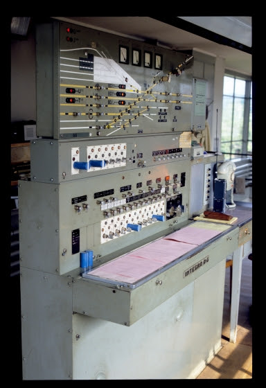 Am Arbeitstisch erkennt man das Bedienungspult für den Fahrdienstleiter: