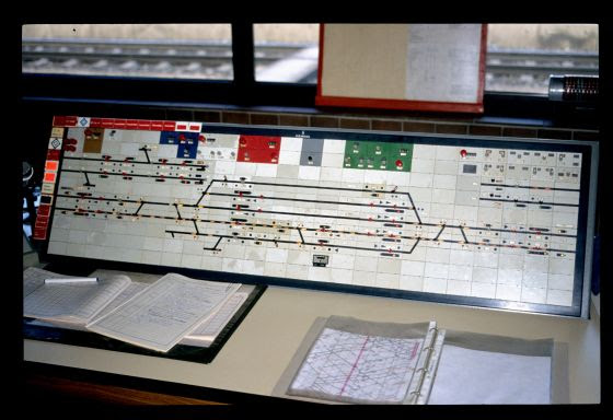 Hier sieht man die Panoramatafel und die Fahrdienstleiterarbeitsplätze: