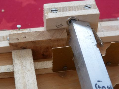 • Die Höhenlage der "Welle" ist ziemlich kritisch. Meine eher sehr ungefähre Zurechtfeilerei der Achsstummel hat bewirkt, dass diese in den Lagern (den Nieten) ziemlich auf- und niederspringen können – das ist ziemlich hinderlich für das saubere Funktionieren. Man sollte daher wohl (a) beim Zurechtfeilen der Achsstummel sehr häufig den Durchmesser messen – durch Einstecken in die Lager und mit einer Schublehre auf das Zielmaß; (b) die Achsstummel eine Spur auf Übermaß feilen und dann die Lager mit einer Reibahle auf ein passendes Maß aufreiben; (c) eventuell die Lager höhenverstellbar machen.