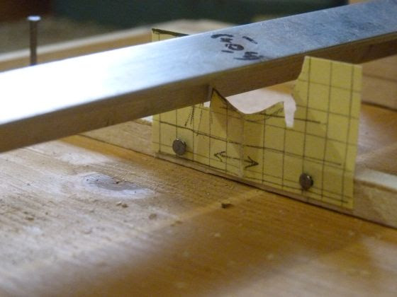 Die Kulisse mit den "Gabeln" habe ich zuerst testhalber auf Karton kopiert und das ausgeschnittene Kartonstück auf dem Schieber mit kurzen Drahtstiften befestigt. Die folgenden Bilder zeigen einige Versuche – der Karton war tatsächlich steif genug, um das Profil einige Male korrekt zu verdrehen. Bei der Höhenlage der Kulisse hatte ich mich vermessen, sodass ich die Ausschnitte auf den Messingplättchen um einige Millimeter tiefer legen musste – aber sonst funktionierte die Konstruktion prinzipiell: