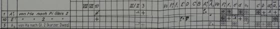Den Verschlussplan "liest" man zeilenweise: Links draußen steht eine Fahrt, z.B. "von Ha nach Pi Gleis 2", also "von Hammerau nach Piding in Gleis 2"; und rechts steht nun der Reihe nach