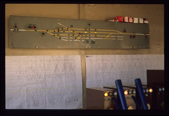 Stellwerk. Auch hier sind alle Weichen schon elektrisch gestellt, wie man an den fehlenden Drahtzügen und Gestängen sehen kann: