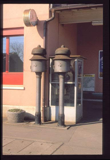 Und hier ist zuletzt ein Bild des Bahnhofsgebäudes, mit zwei auch schon historischen Autobussen und zwei Läutewerken, allerdings nur mit den unbemalten verzinkten Blechgehäusen:
